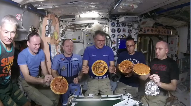 Os seis membros da tripulação da ISS organizaram no começo de dezembro um pizza party sem gravidade. Todos os ingredientes necessários para fazer o prato foram enviados da Terra a bordo de uma nave espacial: massa, molho, queijo, azeitonas, peperoni e até aliche. As pizzas foram assadas em fornos especiais a bordo da estação internacional.