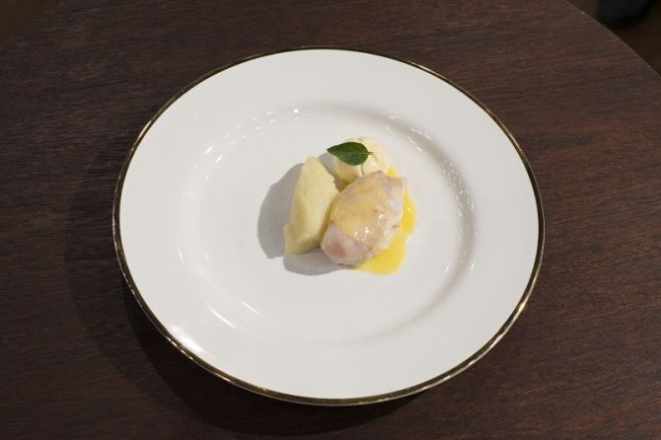 – Corte de fraldinha ao molho holandês acompanhado por purê de batatas e espinafre. A sacada do cozinheiro de colocar o espinafre pra dar leveza ao purê na primeira prova de repescagem garantiu seu avental para entrar no programa.