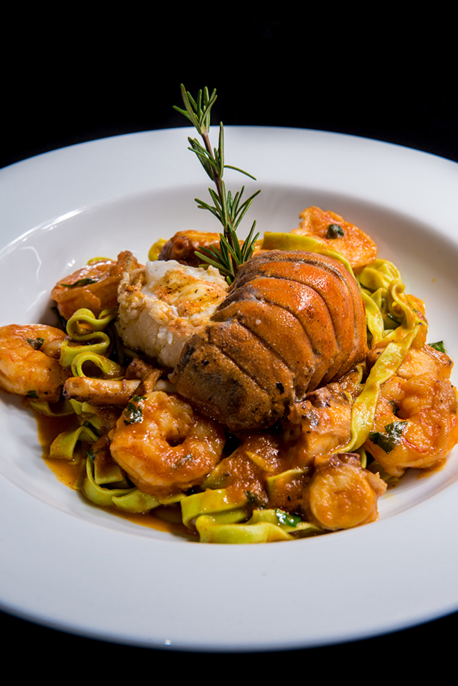 FETTUCCINE DE ESPINAFRE COM CAMARÕES, POLVO E CAUDA DE CAVAQUINHA AO MOLHO DE TOMATE LEVEMENTE PICANTE — Ernesto Ristorante