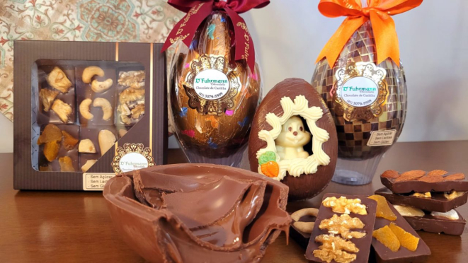 A D’Fuhrmann Chocolates ainda dispõe de uma linha sem açúcar e sem lactose: caixa 6 sabores (R$38), ovo 350g (R$84) e 250g (R$56,80). A loja fica na Av. Com. Franco, 5050 - Uberaba. @dfuhrmannchocolates