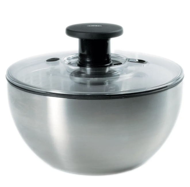 O secador em aço inox da Oxo é perfeito para higienizar diversos alimentos como folhas ou frutas de forma rápida e eficiente graças ao escorredor interno. Pressione a bomba para iniciar a secagem