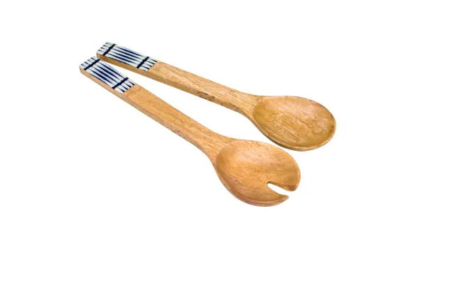 Conjunto de pegadores de salada em madeira com detalhes nas extremidades. Por R$ 92 na