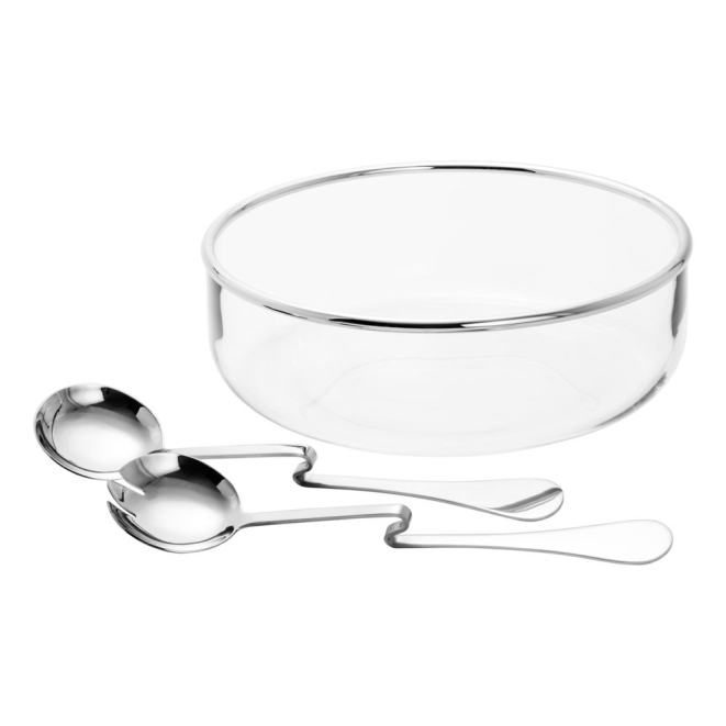 Saladeira clássica em vidro e aço inox com dois pegadores. Dimensão: 25cm de diâmetro. Por R$ 373,40