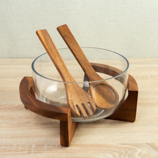Conjunto para salada Wood com quatro peças, sendo um suporte em madeira, dois talheres em madeira