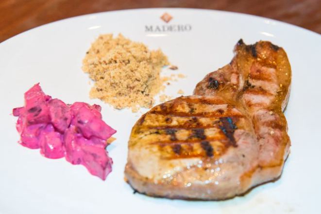 Júnior Durski, da rede Madero, que foi o responsável pelo jantar, defendeu a carne de porco por ser mais saudável e saborosa. Ele serviu o lombo corte inglês (equivalente ao bife de chorizo bovino) grelhado à lenha com salada de beterraba e farofa; e a copa grelhada (que se assemelha ao bife ancho bovino) com cogumelos e purê de batatas. “Temperei as peças apenas com sal e pimenta para ressaltar o sabor da carne”, explicou.