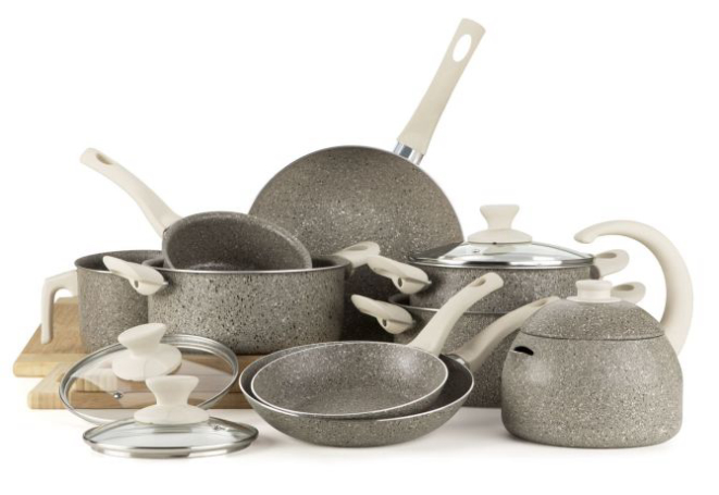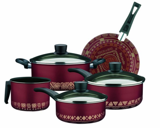 A linha Riquezas do Brasil, da Rochedo, recebeu estampas elaboradas a partir de desenhos indígenas. O conjunto, composto por cinco peças revestidas, tem revestimento antiaderente e indicador de temperatura ThermoSpot. Ele indica quando a frigideira atingiu a temperatura para cozimento, permitindo selar carnes. Também há peças avulsas à venda.