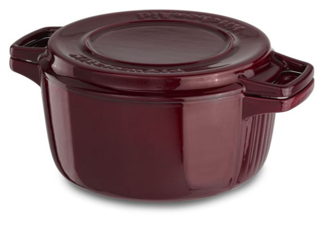 A caçarola de ferro fundido profissional com 3,8L Empire Red da KitchenAid tem interior escuro revestido de porcelana esmaltada, o que dispensa o uso de óleo. A tampa tem duplo uso, pois ao virá-la é possível grelhar alimentos direto no cooktop/fogão.