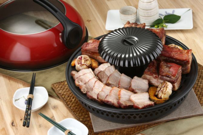 O Direct Gas Fired Oven é mais do que uma panela, mas uma churrasqueira e forno para fogão. Possui revestimento antiaderente triplo de titanium, com tampa em alumínio com visor em vidro. Assa os alimentos por igual na parte superior e inferior através de um dispositivo de circulação de calor criado pela HappyCall.