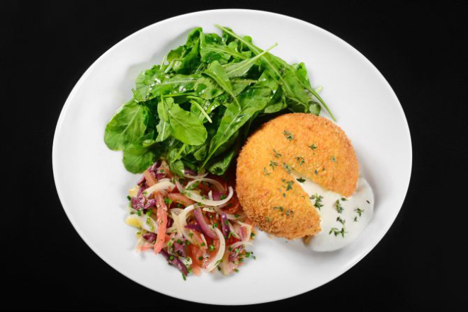 A burrata Bobardí é preparada à milanesa e leva sauté de tomate e cebola julienne, toque de azeitonas pretas, e é servida em cama de rúcula (R$ 66).