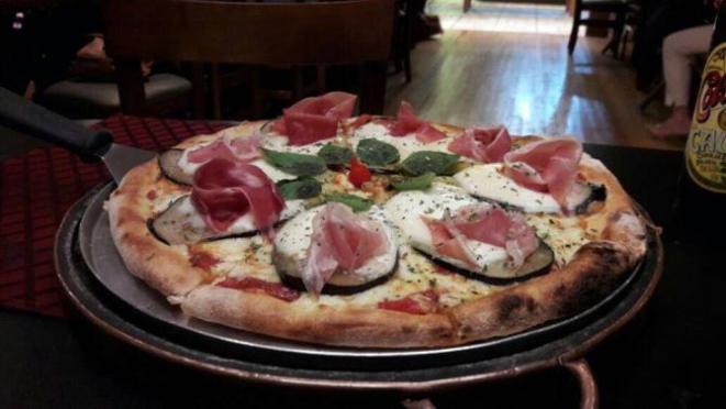 A pizza Amalfitana da Carmela Pizzaria sai de R$ 89 por R$ 53,40). O sabor leva molho italiano, berinjelas laminadas e marinadas no alecrim, muçarela de burrata, presunto Parma e manjericão.