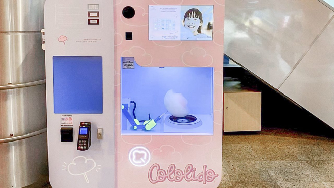Totalmente automatizada, ela torna o processo de compra fácil e rápido. Basta escolher o sabor e a forma desejados, de um total de 18 modelos, e efetuar o pagamento, que varia entre R$ 12 e R$ 15, diretamente no aparelho. Pode pode ser feito com notas de R$ 2, R$ 5 e R$ 10, ou com cartões de débito e crédito de qualquer bandeira. Depois, é só retirar o algodão-doce e reviver a infância.