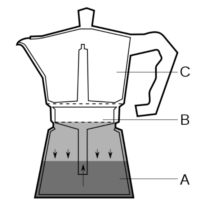Para preparar o café na Moka Express é preciso encher de água a base octogonal (A) até o nível da válvula de segurança. O pó de café é colocado no filtro metálico (B), em formato de funil, que se encaixa na base da máquina. Para fechar basta enroscar a parte superior (C) da máquina na base.