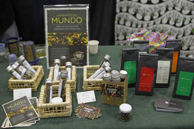 Ainda “em construção”, a Caminho do Chá, casa de chá da tea designer Daniele Lieuthier, está presente na feira no estande Cúpula do Chá, a associação de cinco casas de chá de Curitiba. Ela trouxe quatro blends para vender na feira a R$ 10 cada. Há opções com chá verde, uma com chá preto e outra com oolong (chá azul). Os blends têm cascas de frutas, como a laranja, descascadas e desidratadas especialmente para a marca.