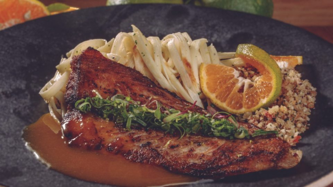 Sugestão: Sirva com tilápia, cavala e camarão, acompanhados de tagliatelle de pupunha com alho-poró, banana-da-terra e farofa cítrica.