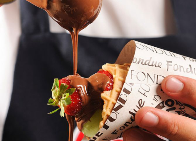 Na Chiquinho Sorvetes, a sensação é o fondue no cone, em duas opções: de frutas (R$ 8), com uva, morango e banana, com calda de chocolate ao leite, e de morango com calda de chocolate ao leite (R$ 11). As frutas são servidas em uma casquinha de sorvete revestida por chocolate.