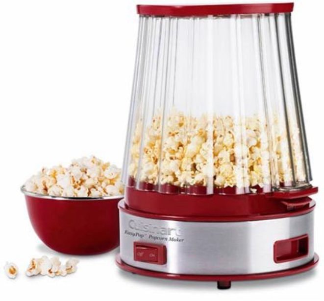 A pipoqueira da Cuisinart tem base em inox escovado, placa antiaderente e tigela em Lexan (material resistente a temperaturas quentes e frias) que também pode ser utilizada para servir. É possível preparar até dez xícaras de pipoca em cinco minutos, com a mínima utilização de óleo. Além disso, a pipoqueira possui alças que não aquecem e placa removível para facilitar a higienização.
