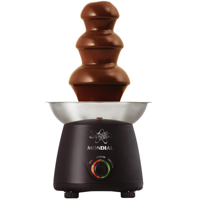A fonte de chocolate da Mondial tem função pré-aquecimento da bandeja e “circulação”, que permite a passagem do chocolate derretido pela torre, caindo pelas cascatas. É desmontável e fácil de limpar.