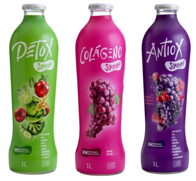 O gostinho do suco de uva em versões funcionais. A Campo Largo Sucos, divisão do Grupo Famiglia Zanlorenzi, lançou a linha de sucos SIMMM!. A bebida é disponível em três opções: uva enriquecida com colágeno,e antiox (mistura de várias frutas vermelhas e uva) e detox (suco verde). Todos são envasados em embalagens de vidro.