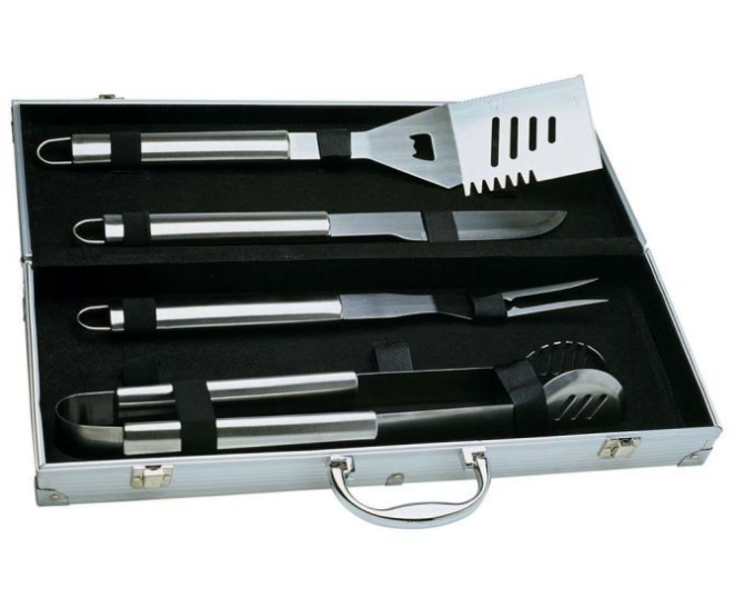 A caixa deste kit é produzido em inox e acompanha um estojo. Possui quatro peças: um garfo, uma faca, um pegador e uma espátula. O conjunto mede 45 x 15 cm.