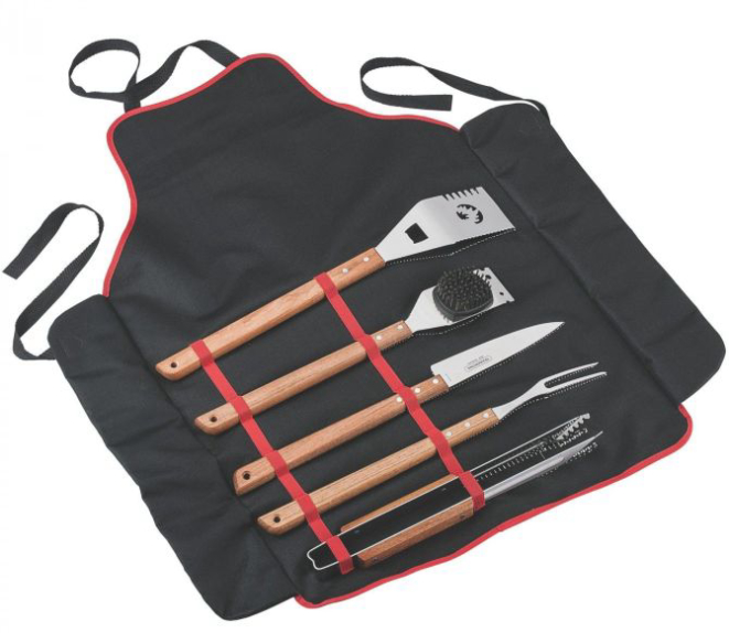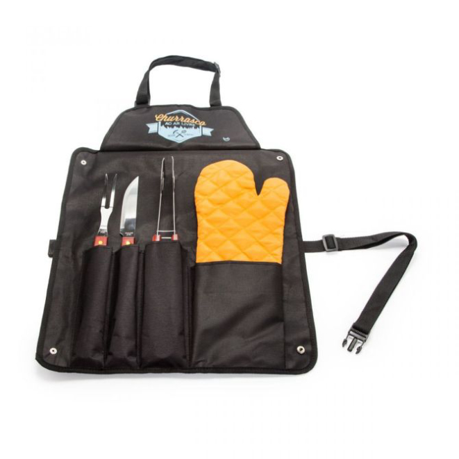 O acessório tem avental com alças reguláveis, luva, garfo, faca e um pegador de metal. Os elementos encaixam no avental e facilitam o transporte.