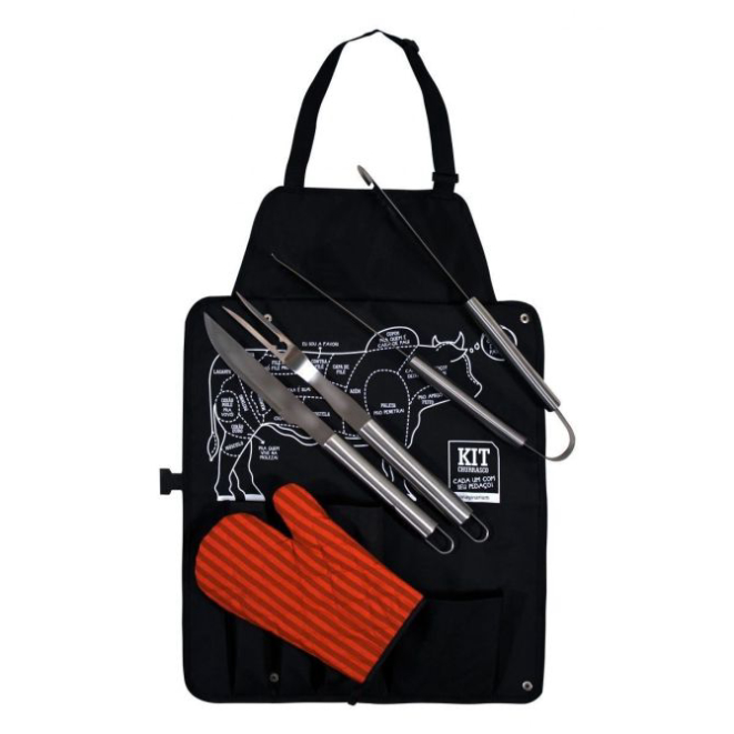 O kit para churrasco da Tramontina tem seis peças: uma faca com lâminas de maior durabilidade do fio devido ao tratamento térmico; um garfo, uma espátula e um pegador de aço; uma escova de aço inox e um avental de nylon, que mede 54x 13x 8,5 cm.
