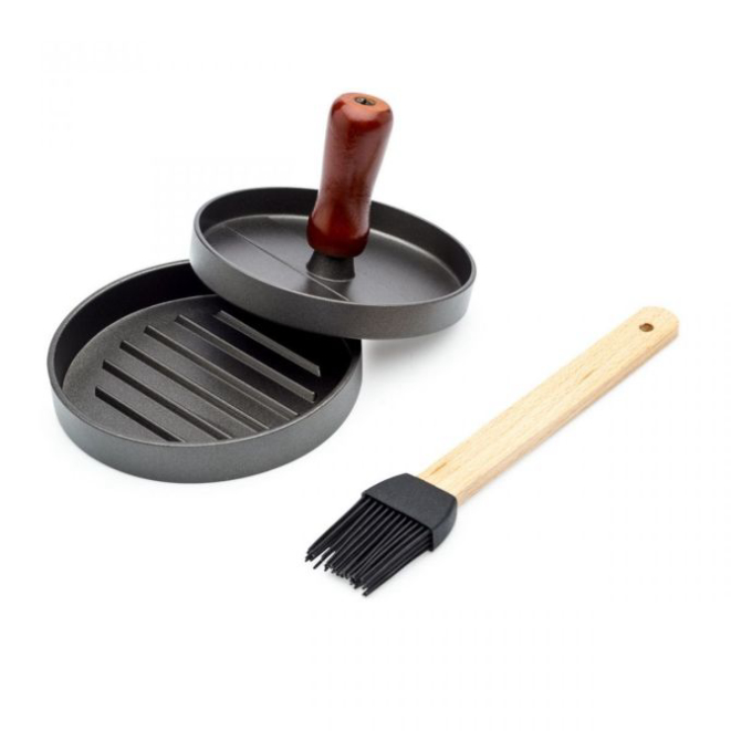 Acessório para fazer hambúrguer. O molde, de 12 cm de diâmetro, é feito de metal e madeira e acompanha um pincel culinário. O kit não deve ser utilizado no fogão como grill para grelhar a carne, somente para moldar o formato do hambúrguer.