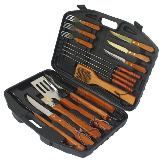 O conjunto para churrasco Prime de 16 peças, da Mainstays, é uma ótima opção para os churrasqueiros. É versátil e inclui todos os utensílios apropriados para fazer um bom churrasco, sendo peças com ponta de aço inoxidável que garantem resistência a impacto e altas temperaturas, e cabo de madeira natural. Acompanha uma maleta com alça para guardar e transportar as peças..
