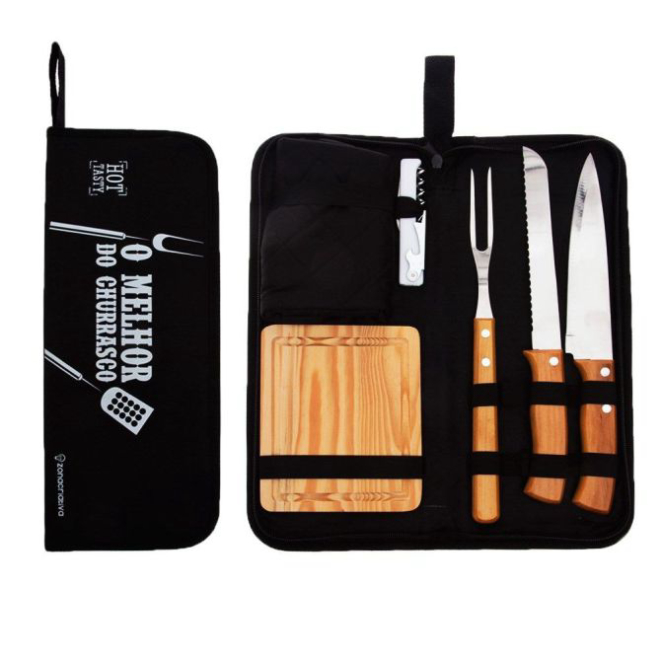 O kit para churrasco da Tramontina tem seis peças: uma faca com lâminas de maior durabilidade do fio devido ao tratamento térmico; um garfo, uma espátula e um pegador de aço; uma escova de aço inox e um avental de nylon, que mede 54x 13x 8,5 cm.
