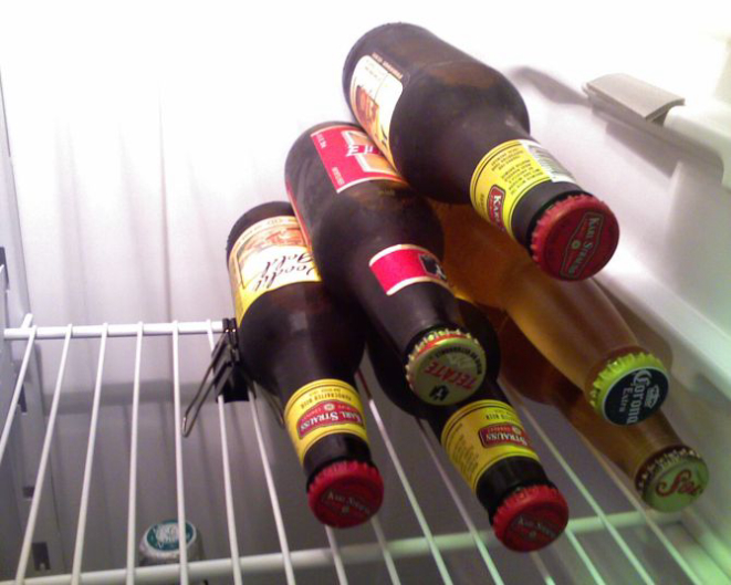O caos da sua geladeira está com os dias contados. Chega de garrafas caindo em cima de potes ou amassando as frutas. Esse método vai ajudar a mantê-las juntas, sem deslizar pelas prateleiras. Tudo que você precisa é de um grampo de folhas grande. Prenda-o na grade da prateleira. Ele impedirá que as garrafas se movimentem.