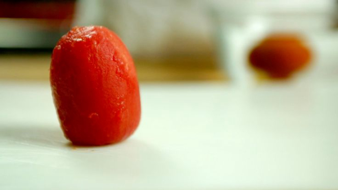Outra técnica, que facilita (e muito!) na hora de descascar o tomate: distribua-os em uma forma e leve ao forno a 250° C por cinco minutos, tempo suficiente para a casca ficar enrugada. Depois de retirar do forno é só puxar a casca e ela descolará facilmente. E o melhor: o tomate fica intacto.
