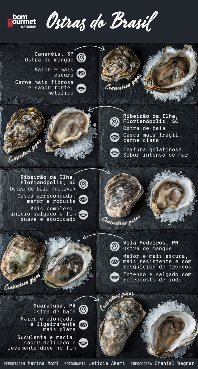 No Brasil, três regiões se destacam pelo cultivo de ostras: Santa Catarina, detentora de 97,9% da produção nacional, Paraná e São Paulo. Os estados produzem as mesmas espécies de molusco, uma nativa e uma estrangeira. Porém, mesmo com a proximidade geográfica, as peculiaridades do ambiente em que são cultivadas tornam cada ostra única. Quando provadas lado a lado, essas singularidades se acentuam de forma surpreendente.