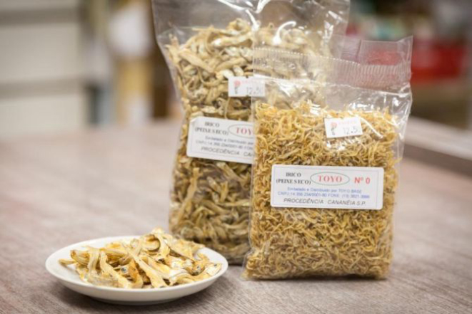 Quem não o conhece pode se assustar porque esse peixinho seco vem até com os olhos. Iguaria japonesa, ele pode ser consumido puro – como um snack – ou moído na comida. Além de saboroso, ele é rico em cálcio. No box Shizen (número 280), (41) 3362-9165, ele pode ser encontrado em três tamanhos, o micro (0), pequeno (1) e um pouco maior (2). Os preços variam de R$ 7,80 a R$ 12,50 (embalagem com 100 g).
