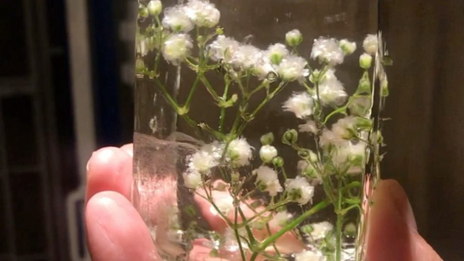 "Primeiro, a flor é higienizada, depois branqueada, desidratada e, por fim, ela vai para o gelo. A técnica leva em torno de 48 horas para resultar em um grande bloco sólido e possibilitar o corte com as flores na vertical, para parecer que elas estavam ali dentro mesmo, como se tivessem sido plantadas", explica a especialista.
