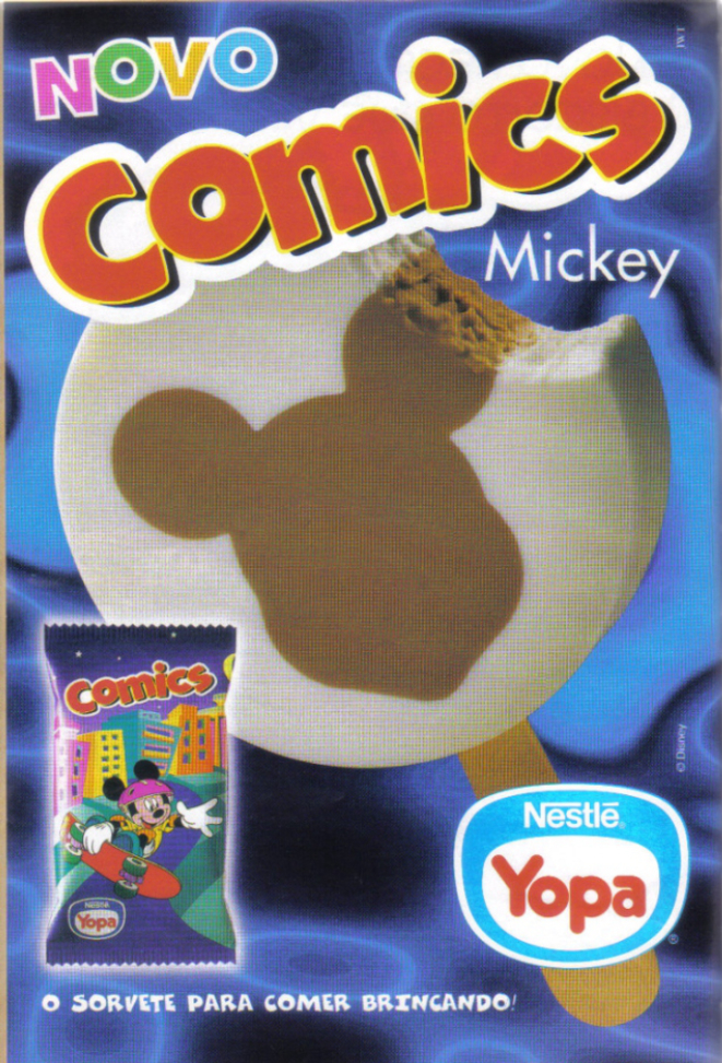 Em 1997, a Nestlé — que até os anos 2000 ainda usava o nome “Yopa” para seu segmento de sorvetes — lançou o sorvete Comics, uma deliciosa combinação de chocolate preto, branco e a célebre figura do Mickey.