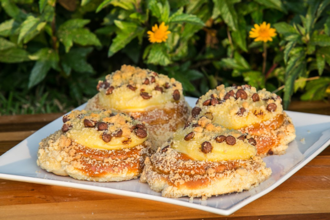 O Chineque Gotas de Chocolate da Mannah Confeitaria é uma releitura do pão doce de origem alemã feito com massa de rosca doce, redonda e fofinha. É coberto com creme de baunilha e leva gotas de chocolate ao leite e farofa. A doçura fica na medida certa, bem espalhada entre os 120 gramas da guloseima. Preço: R$ 2,75 a unidade.