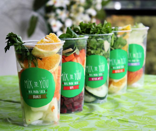 Tem também o UP!, com beterraba, cenoura, agrião, gengibre e laranja; o Relax, feito com alface, maçã, abacaxi, hortelã e gengibre; e o Bronze, composto por cenoura, melão, laranja, salsinha e gengibre. Os sucos vêm com as frutas e verduras inteiras, prontas para serem batidas no liquidificador.