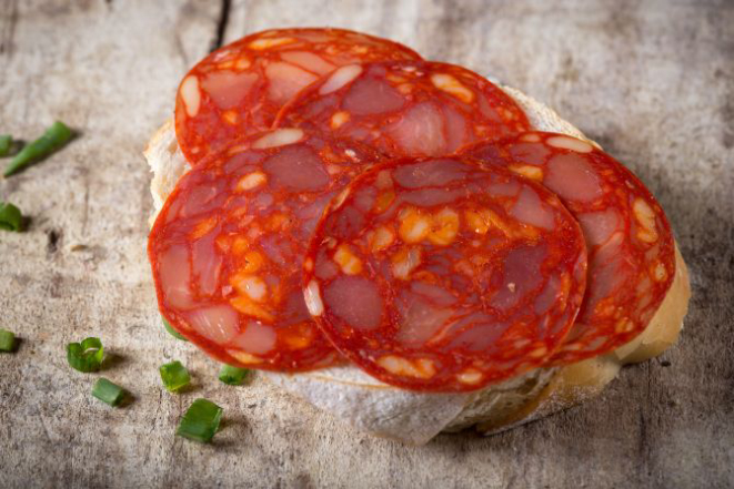 Esse enchido preparado com carne e gordura de porco é temperado com páprica picante, por isso seu sabor é adocicado. As partes mais claras, que parecem ser gordura, são na verdade feitas com carnes variadas. A peça tem peso de aproximadamente 1,5 kg. É produzido nas cidades de Murcia e Jabugo, no sul do país.