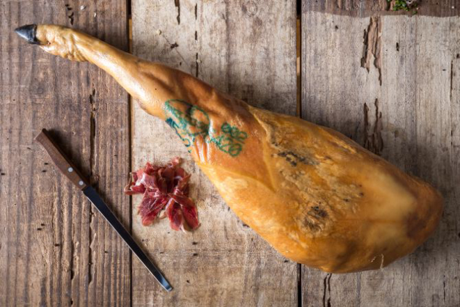 O jamón ibérico é obtido apenas de porcos ibéricos, também chamados de pata negra, é tem período de cura de até 48 meses.