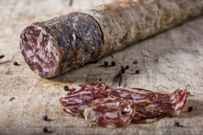 Esse salame defumado chama atenção por ter uma capa feita com a pimenta-do-reino preta e branca. Tem sabor suave e leva um toque de páprica doce.