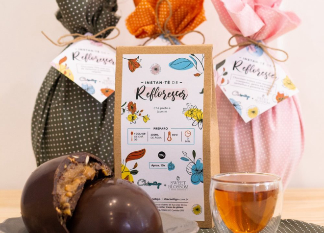 Ovo com chá? Isso mesmo. A marca curitibana Chá Contigo lançou chás harmonizados com ovos de chocolate. São três opções. A primeira é um chá verde com rosas e pimenta rosa (20 g), harmonizado com ovo de páscoa de chocolate branco com recheio de ganache de rosas e geleia de frutas vermelhas (400 g). O chá oolong com côco e calêndula (20 g) ficou em conjunto com o ovo de chocolate ao leite com recheio de brigadeiro cremoso de côco tostado (400 g). E o chá preto com jasmim (20 g) foi harmonizado com chocolate intenso 70% com recheio de caramelo com flor de sal. Os blends de chá harmonizados com os ovos da coleção Reflorescer Chá Contigo + Sweet Blossom custam R$ 98 e podem ser comprados pelo WhatsApp (41) 98900-2033. Informações no Instagram @chacontigo