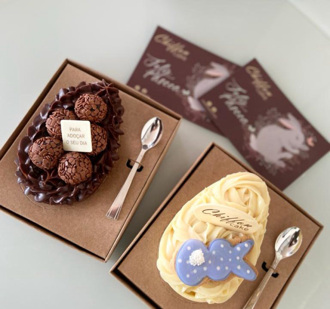 A confeitaria tem diversas sugestões para a data. Um dos produtos diferentes é o ovo de Páscoa no pote (R$ 36,50). Um doce finalizado com chocolate belga por cima, no qual se quebra a casquinha na superfície para ter acesso ao recheio. Disponível nos sabores brigadeiro, dois amores, ninho com ganache e ganache. Também há ovos recheados (R$ 85, 400 g), nos sabores ninho (uva ou Nutella), brigadeiro e ganache, estrogonofe de nozes, dois amores e brigadeiro branco. Quem quer um presente completo, ainda tem as cestas e kits (uma vem até com cesta de piquenique), com preços que variam de R$ 55 até R$ 225. Encomendas até 31 de março. Informações no Instagram @chiffoncakecuritiba ou WhatsApp (41) 99897-6548.