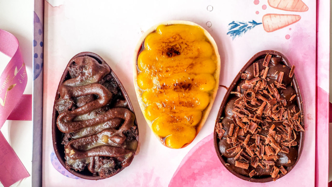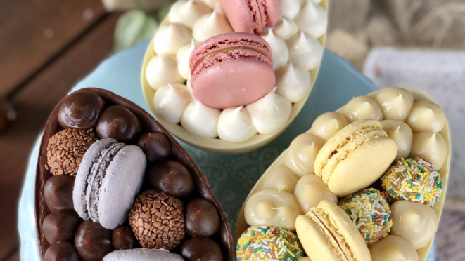 A chef Maria Lethycia oferece vários tipos de ovos. Alguns são exclusivos. Uma delas é a coleção Entremet, com quatro sabores da sobremesa dentro do ovo: caramel slice, brûlée com frutas vermelhas, maracujá com chocolate e doce de leite (R$ 159, de 500 g a 900 g e R$ 189, de 900 g a 1,5 kg – encomendas até o dia 20 de março). Outros dois diferentões são o ovo macaron, com casca de macaron, recheio de mousse de frutas vermelhas, creme 4 leites e macarons em cima (R$ 139, 100 g a 350 g e R$ 159, 500 g a 900 g) e o profiterole, um ovo recheado de chocolate e caramelo com choux com craquelin recheado de chocolate e caramelo tofee (R$ 139 e R$ 159). Também há opções infantis e com os nomes de pontos turísticos de Paris. Informações sobre a compra de ovo de Páscoa: Instagram @douceviecuritiba