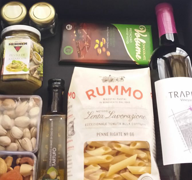 Para a data, a loja oferece duas sugestões de kit. A caixa chef gourmet inclui uma garrafa de vinho tinto chileno, um pacote de penne italiano, azeite trufado, molho pesto de aspargos, duas caixinhas de nuts, chocolate de pistache e duas porções de brigadeiro gourmet de colher. Já a caixa aperitivos inclui um lambrusco italiano, queijos (gouda, brie, gorgonzola e fundido), maionese francesa, caixa de torradas com creme de parmesão, caixa de pistache, 3 opções de chocolates importados e um brigadeiro gourmet de colher. As duas caixas saem pelo mesmo valor R$ 179,00.