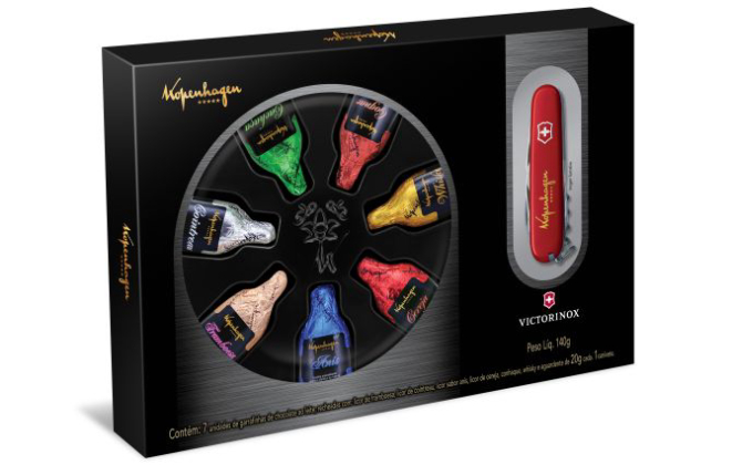 Para celebrar a data a loja uniu chocolates a objetos e bebidas, que são ícones do universo masculino. O resultado são dois kits, o Jack Daniels (R$ 85,00) e Victorinox (R$ 109,00). O primeiro item vem com 200g de chocolate amargo 70% cacau nos sabores: tradicional, laranja, framboesa e menta. Além disso, há uma miniatura de Jack Daniels 50ml e um copo de whisky exclusivo da marca americana. Já o Kit Victorinox apresenta sete garrafinhas de chocolate ao leite recheadas com diferentes bebidas nos sabores: framboesa, anis, whisky, conhaque, cachaça, contreau, cereja e um canivete Victorinox do exército suíço, feito em inox, com 12 múltiplas funcionalidades.