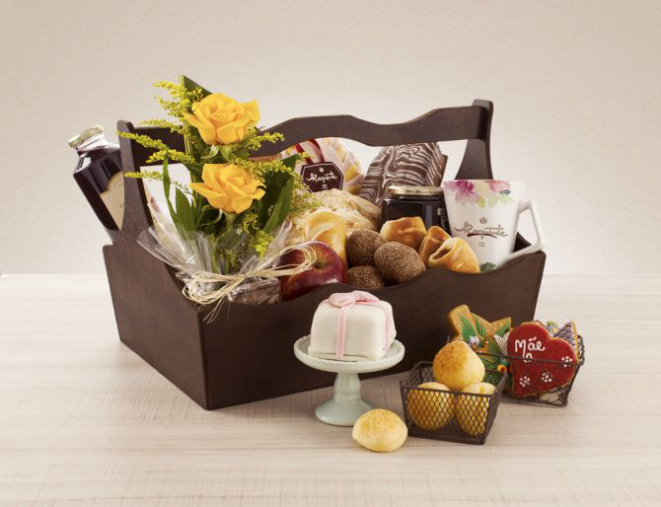 Também há três tamanhos de cesta de café da manhã com flores. A pequena vem com oito itens (R$ 96) e tem sonho de brigadeiro, broa de centeio, biscoito palmier, pão Pizzacatto, pão de queijo, queijo processado e bolo decorado. A cesta tamanho M tem 22 itens (R$ 199) e tem bolo de banana, pão funcional, pão de mel, pão de minuto, pão de beterraba, sonho de doce de leite, broa airosa, pão Pizzacatto, petit pan, pão de queijo, bolacha artesanal decorada, queijo processado, sachê de cappuccino, geleia, mel, uma mini-tábua de frios, suco de laranja, chá mate orgânico, frutas e caneca decorada.