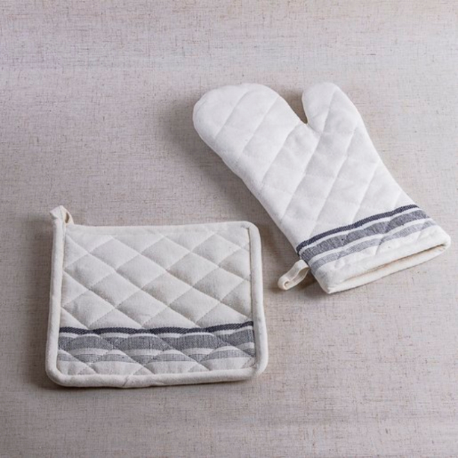 O kit de luva com aparador de panela da linha Simple é produzido em 80% algodão e 20% poliéster. Auxilia no preparo de alimentos e na hora de servir, além de ser decorativo. Por R$ 12,99, na Etna.