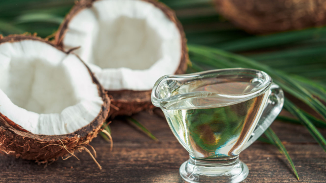 O óleo de coco é um dos “óleos saudáveis” mais polêmicos do mercado. É rico em gordura saturada, no entanto, é à base de plantas. O óleo de coco também tem sabor agradável e é rico em MCTs (triglicerídeos de cadeia média), que o corpo pode usar como energia. Feito a partir do fruto da palmeira de coco, o óleo de coco tem sido promovido como a melhor alternativa à manteiga, principalmente entre vegetarianos, que não comem gordura animal. É um sólido branco à temperatura ambiente, com uma consistência mais parecida com a da manteiga ou gordura do que com um óleo líquido. Como o óleo de coco tem um ponto de fumaça médio, o ideal é usá-lo em bolos, muffins e biscoitos.