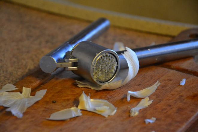 Assim como no caso do ralador, a máquina não consegue atingir os pequenos resíduos que ficam o espremedor de alho. Você deve lavar à mão, preferencialmente com a ajuda da ponta de uma faca, que serve para retirar até os resíduos mais difíceis de serem alcançados.