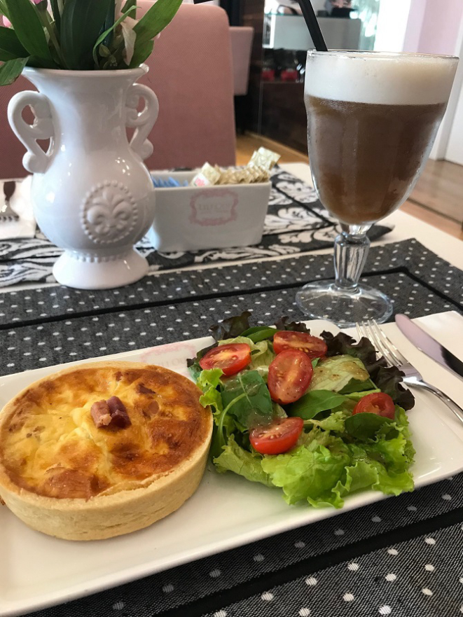 O café e confeitaria serve a quiche de lorraine acompanhada de uma mini salada com molho especial (R$ 15,50). A quiche leva bacon e queijo em seu recheio. Para acompanhar a casa recomenda um matte batido com limão e servido gelado (R$ 6,50).