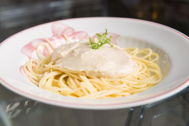 Para acompanhar o spaghetti, ela optou por um molho béchamel à base de manteiga clarificada (processo que elimina a lactose da manteiga comum), farinha de arroz no lugar da farinha de trigo e leite de castanha de caju, no lugar do de vaca. Antes de processar as castanhas no liquidificador, a dica é colocá-las de molho em água por cerca de oito horas. “Isso serve para tirar os fitatos e deixar a castanha mais digerível”, orienta.